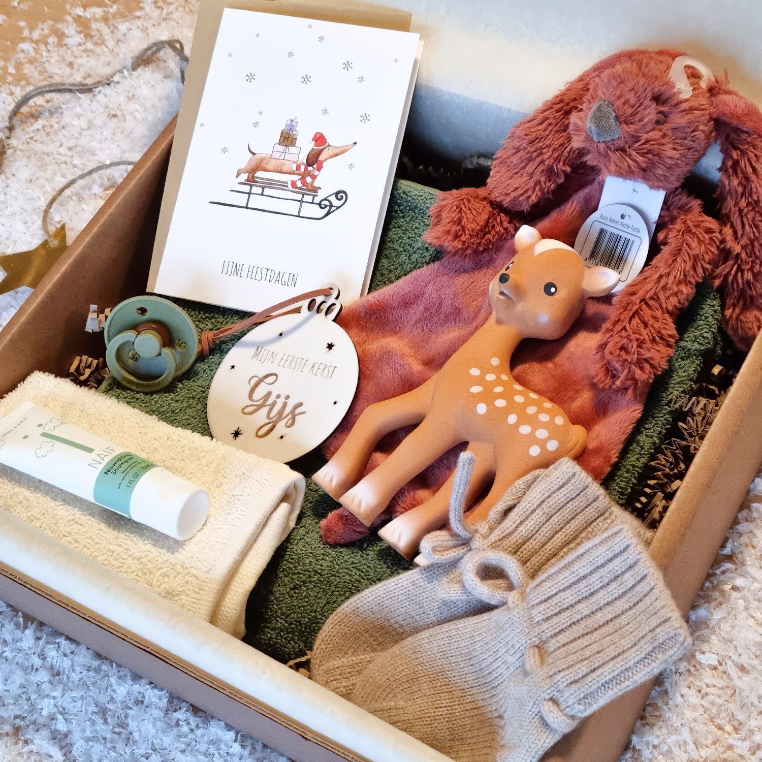 Onze KERSTSPECIAL! Welke Baby (to be) ga jij deze kerst verrassen met deze unieke cadeaubox, gevuld met fijne producten zoals ‘Fan Fan’ het hertje, heerlijke Merino Wol slofjes en een houten kerstbal met naam. Je kan het cadeau onder de kerstboom leggen of rechtstreeks versturen naar de ontvanger.